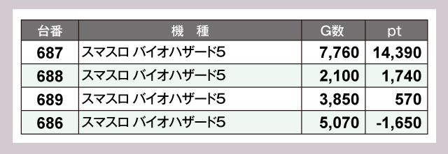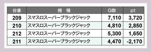 4台設置の『スマスロ バイオハザード5』と『スマスロスーパーブラックジャック』はどちらも3台がプラスptで、回されたG数に比例して好成績となっている。
