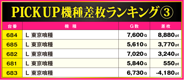 今回のPICK UP機種は全3機種。ハイスコアを記録した『スマスロスーパーブラックジャック』と『L 東京喰種』以外に『L ダーリン・イン・ザ・フランキス』から+7,000ptといった好成績が確認されている。しかも、3機種トータルの全12台中9台がプラス差枚となっているだけにファンにとって充実の一日となったのは間違いないだろう。