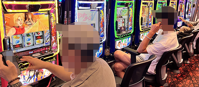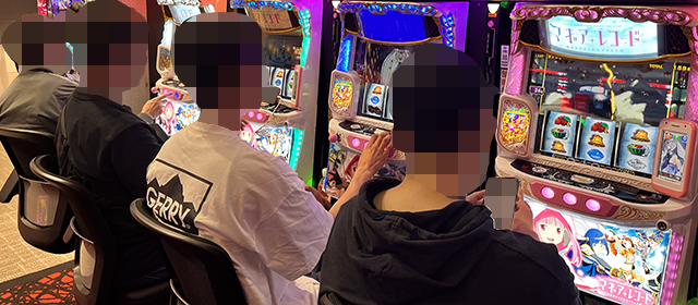 取材時の店内はすでにスロットコーナーが盛り上がっていて、とくにスマスロのシマがヒートアップしている様子だった。どんなデータを見せてくれるのか、さっそくチェックしていくぞ!