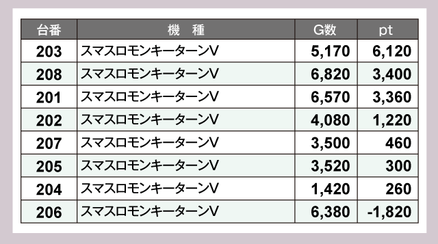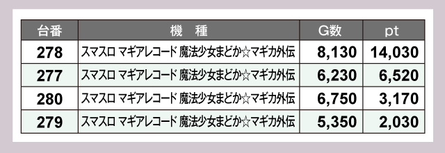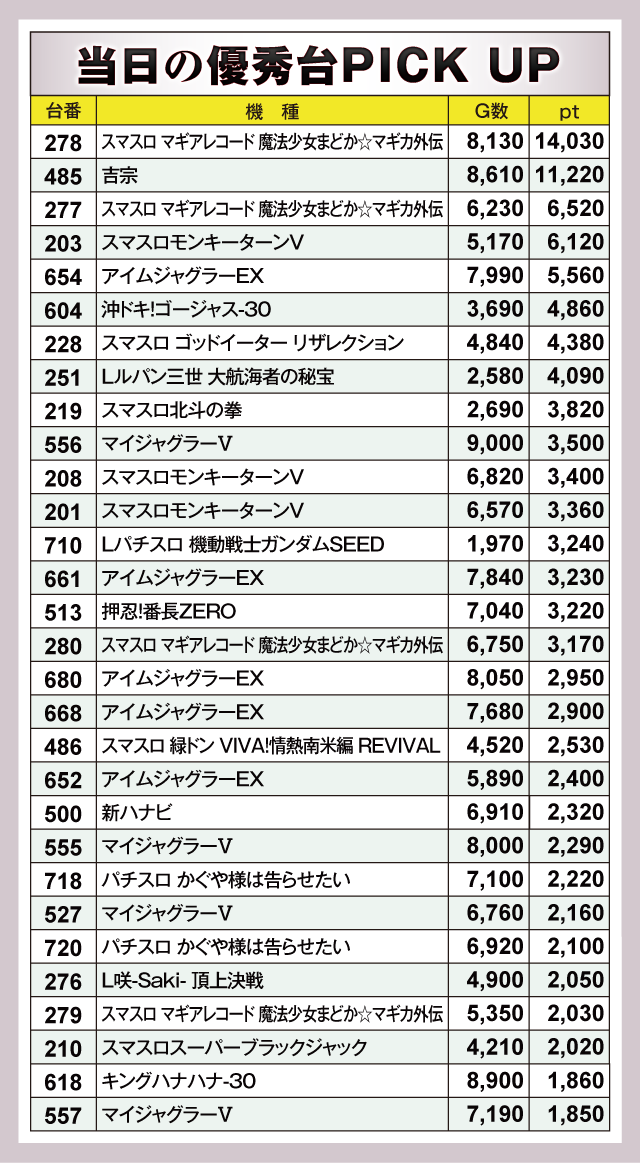 大活躍したのは『スマスロ マギアレコード 魔法少女まどか☆マギカ外伝』。278番台が+14,030pt、277番台が+6,520ptと驚異的な成績だった。『吉宗』485番台も+11,220ptで、負けず劣らずの好成績となっている。他にも『スマスロモンキーターンV』203番台の+6,120pt、『アイムジャグラーEX』654番台の+5,560ptなど、誰もがうらやむようなptが詰まった、魅惑のデータが仕上がっていた。
