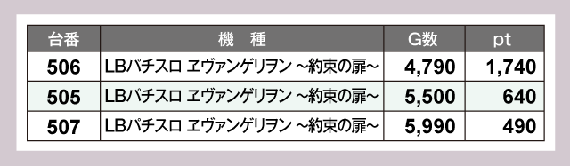 3台設置の『LBパチスロ ヱヴァンゲリヲン ~約束の扉~』は全台がプラスptとなっていて、安定感の高さを証明していた。