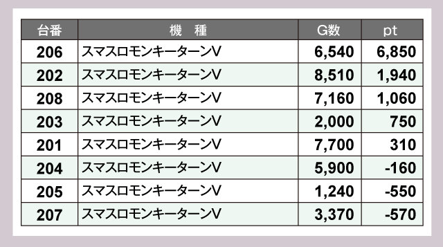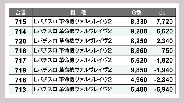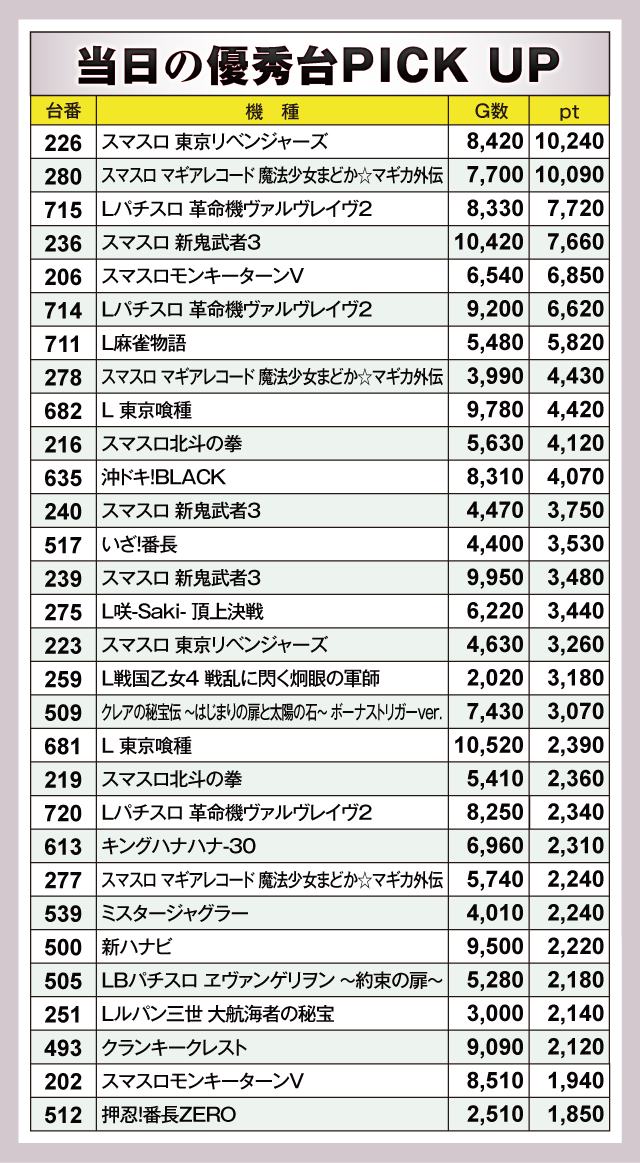 『スマスロ 東京リベンジャーズ』226番台が+10,240pt、『スマスロ マギアレコード 魔法少女まどか☆マギカ外伝』280番台が+10,090ptと、1万ptオーバーの好成績で周囲の注目を集めていた。そして『Lパチスロ 革命機ヴァルヴレイヴ2』715番台が+7,720pt、『スマスロ 新鬼武者3』236番台が+7,660ptでつづく。さらに『スマスロモンキーターンV』206番台の+6,850pt、『Lパチスロ 革命機ヴァルヴレイヴ2』714番台の+6,620ptなど、優秀台が詰まった豪華なデータが仕上がっていた。
