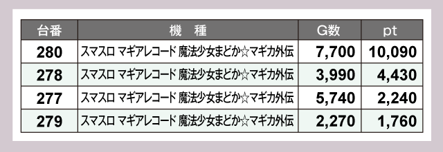『スマスロ マギアレコード 魔法少女まどか☆マギカ外伝』は1万ptオーバーの280番台も含め、4台すべてがプラスpt。間違いなくこの日の中心的存在だった。