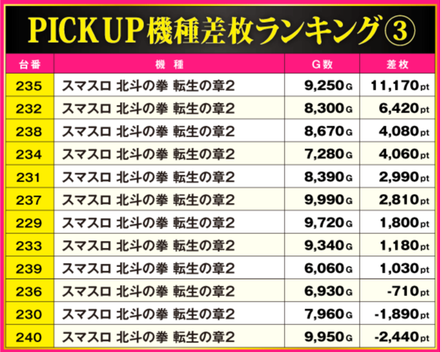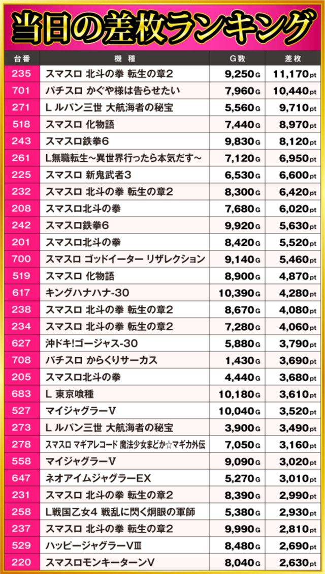 この日、最もプレイヤーの注目を集めたのが『スマスロ 北斗の拳 転生の章2』で、235番台が+11,170ptを叩き出しランキングトップに。続く『パチスロ かぐや様は告らせたい』も万枚超、『Lルパン三世 大航海者の秘宝』から+9,710ptが飛び出すなど、差枚TOP3が実にハイレベルな結果を残しファンを喜ばせていた。