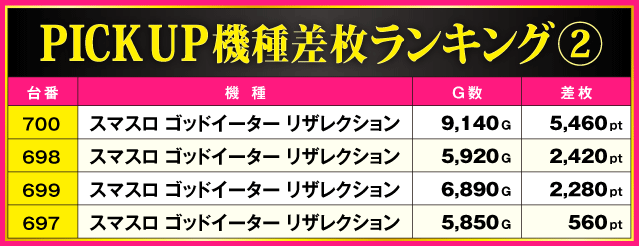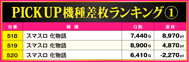 次にPICK UP機種の状況をチェック!! ランキングを制した『スマスロ 北斗の拳 転生の章2』は、その他にも+6,420ptや+4,000pt超が2台も発生する盛況ぶりを披露。さらに、『スマスロ 化物語』からは+8,970pt、『スマスロ ゴッドイーター リザレクション』からは+5,460ptが確認されている。