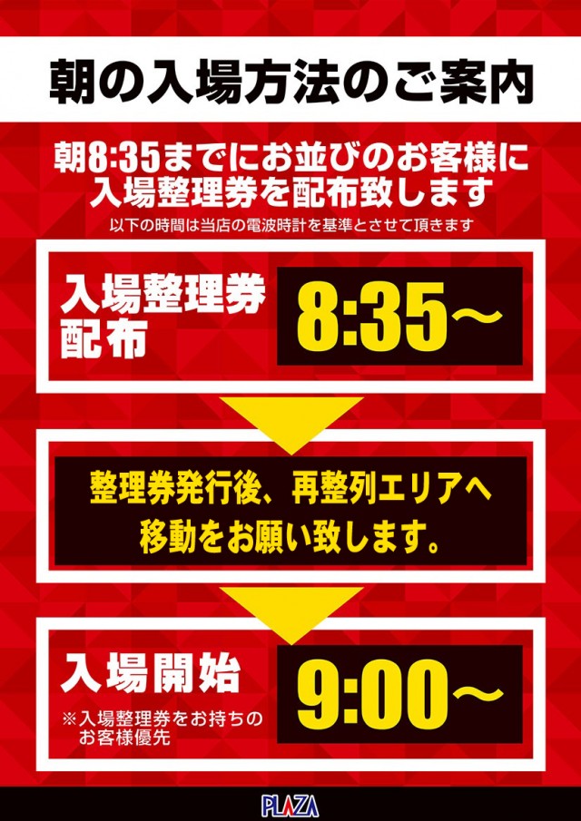 毎朝8:35迄にお並び頂のお客様に入場整理券を配布致します。 |