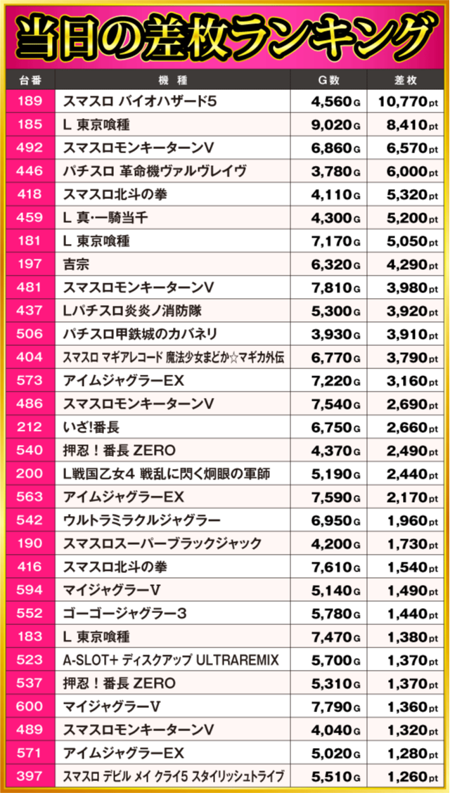 この日は、人気のスマスロを中心に多数のハイスコアが発生。そんな中、『スマスロ バイオハザード5』が万枚超の+10,770ptを叩き出しランキングトップに輝いた。さらに、『L 東京喰種』が+8,410pt、『スマスロモンキーターンV』が+6,570ptといった見事な結果を残している。