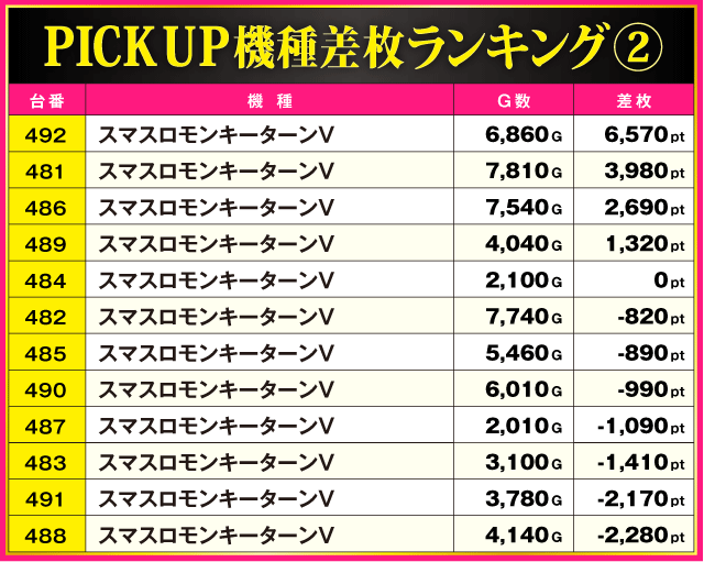次にPICK UP機種の状況を見ていこう。『L 東京喰種』からは、前述の+8,410pt以外に+5,050pt、『スマスロモンキーターンV』からは+6,570ptを確認。また、『ウルトラミラクルジャグラー』は全3台中2台がプラス差枚となっているだけに、ファンにとって充実の一日となったのは間違いないだろう。