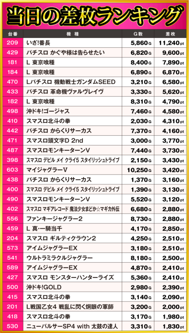 今回のPICK UP機種は差枚上位にランクインした3機種。ハイスコアが飛び出しただけでなく、3機種トータルの全13台中6台がプラス差枚で実戦を終える見事な結果を残しているだけに、ファンにとって充実の一日となったのは間違いないだろう。