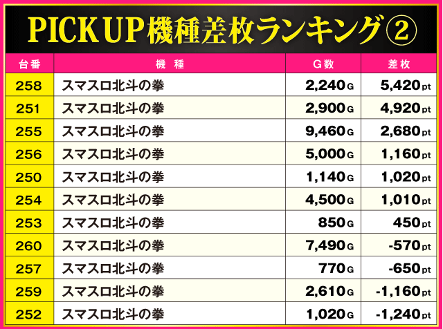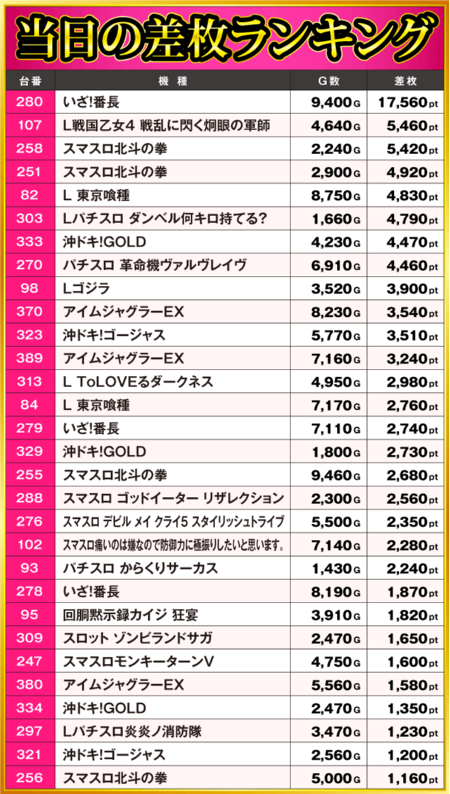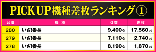 今回のPICK UP機種は差枚上位にランクインした3機種。ハイスコアが飛び出しただけでなく、3機種トータルの全18台中12台がプラス差枚で実戦を終える見事な結果を残しているだけに、ファンにとって充実の一日となったのは間違いないだろう。