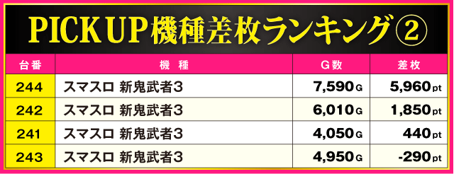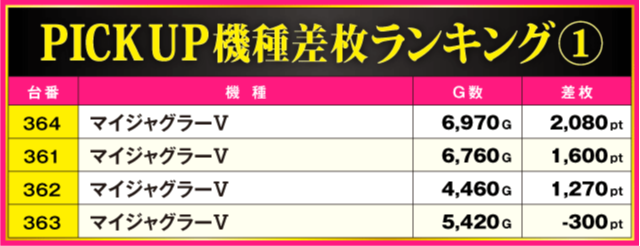 続いてPICK UP機種の状況をチェックしていくと、ランキングを制した『スマスロ 新鬼武者3』以外に2つのジャグラーシリーズからも多数の好調台を確認。最終的に3機種トータルの全12台中8台がプラス差枚で実戦を終えているだけに、ファンにとって充実の一日となったのは間違いないだろう。