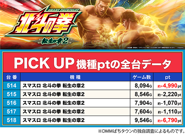 「スマスロ 北斗の拳 転生の章2」は、518番台が約+6,700ptオーバー。