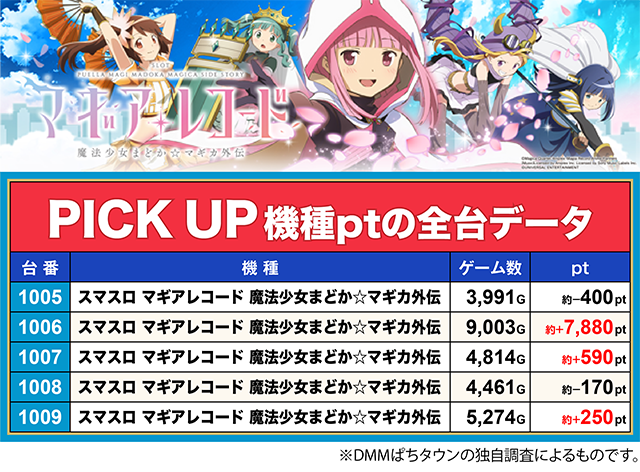 「スマスロ マギアレコード 魔法少女まどか☆マギカ外伝」は、1006番台が約+7,800ptオーバー。