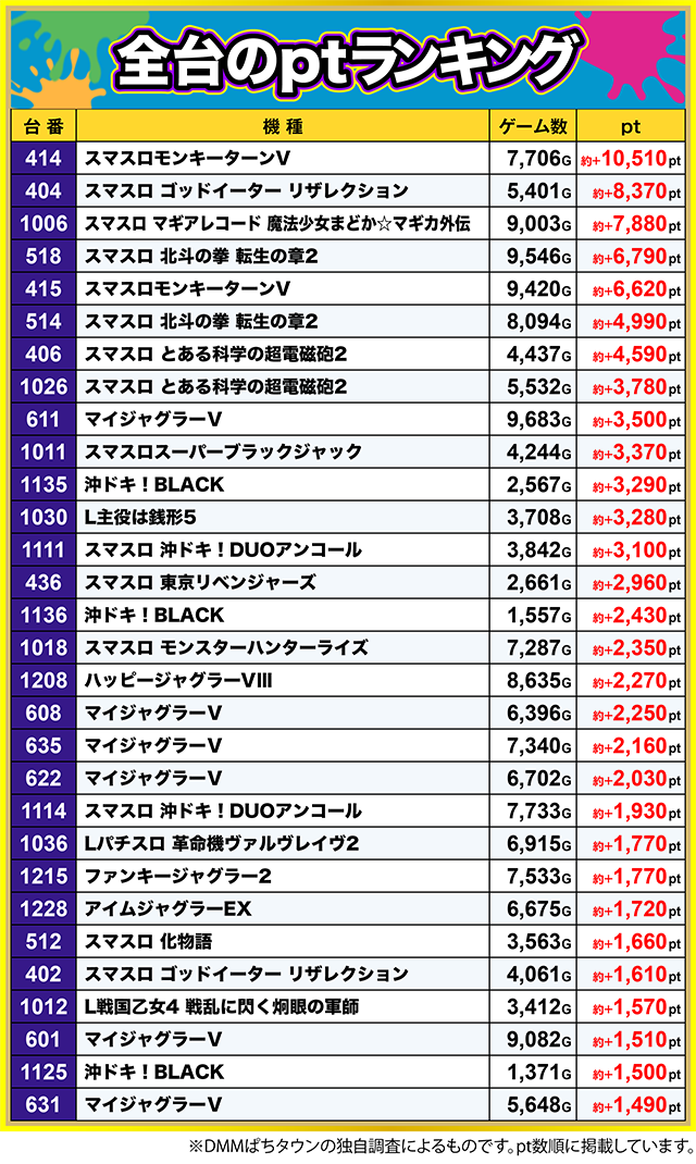 7台が約+1,400ptを超え、約+3,500ptとなる台もあった。