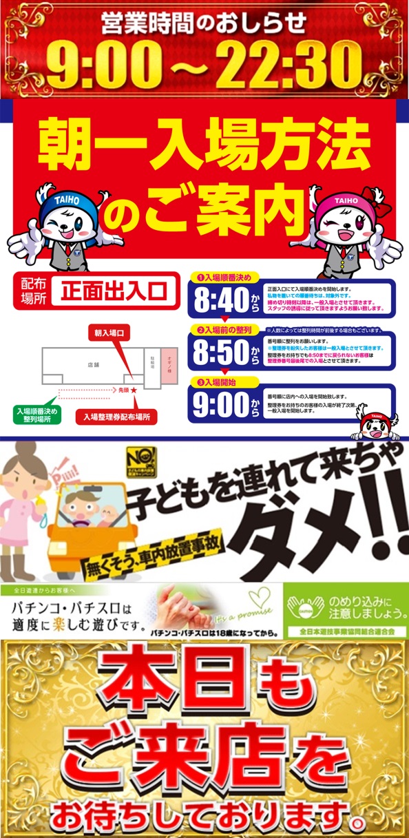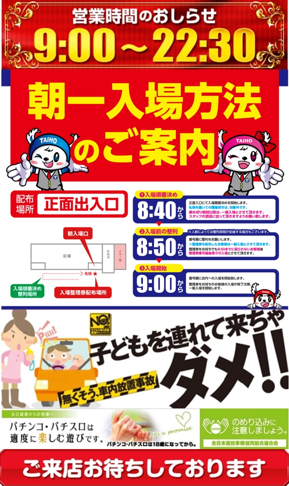 毎朝 8:40分頃 ~ 入場順番決め → 8:50頃 ~ 入場前の整列 → 9:00 ~ ご入場開始(予定) |