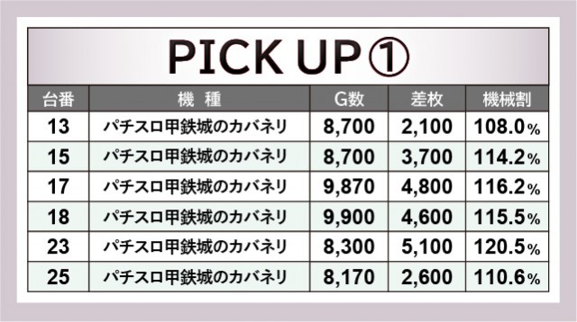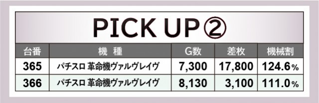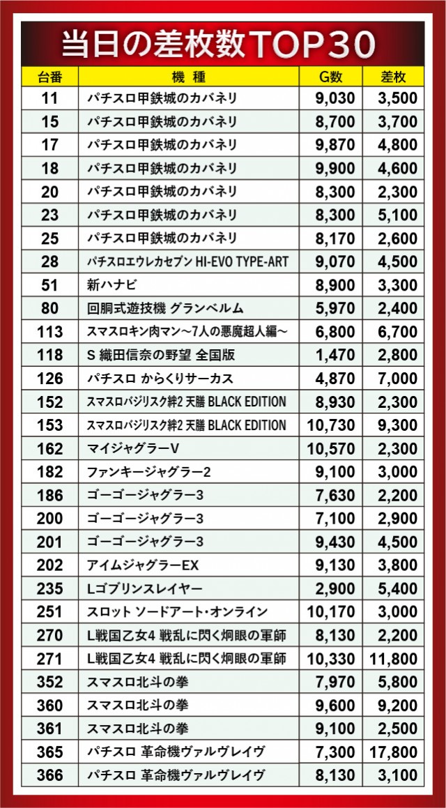 『パチスロ鋼鉄城のカバネリ』はいずれも高い回転数をマークしており、同機種の人気だけでなく、相当な信頼を寄せられている様子が窺える。23番台+5,100枚という回転数と差枚数が比例する展開も見られ、より一層に同機種が愛されるようになったはずだ。そして『パチスロ 革命機ヴァルヴレイヴ』365番台+17,800枚という凄まじい熱量も見逃せず、まだまだ支持を集めるだけの実力を発揮していた。