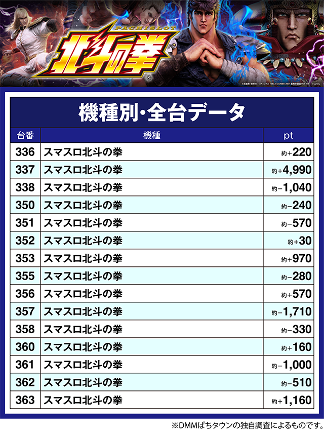 ほかにも、「スマスロとある魔術の禁書目録」の116番台は約+6,850pt、「スマスロ北斗の拳」の337番台は約+4,990ptと、結果を残した台は多い。