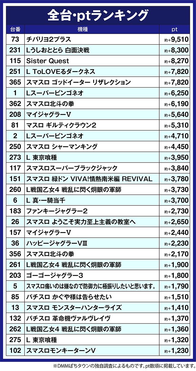 ほかにも、「チバリヨ2プラス」の73番台が約+9,500ptオーバー!!
