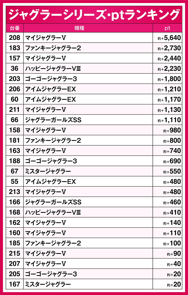 「ファンキージャグラー2」の183番台と「ハッピージャグラーVⅢ」の36番台も約+2,200ptオーバー。