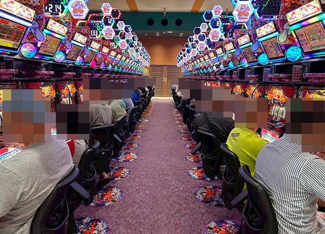 7月12日、静岡県御殿場市にある「タイホー御殿場大坂」へと向かった。今回の取材は、「MY CHANGE取材」だ。笑顔で遊技を楽しんでいるプレイヤーが多く、いくつもの台が輝いてみえた。