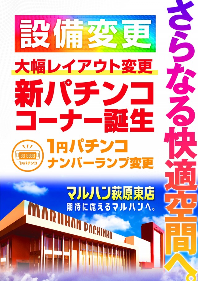 【マルハン萩原東店】明日7月21日新台入替初日9時00分開店