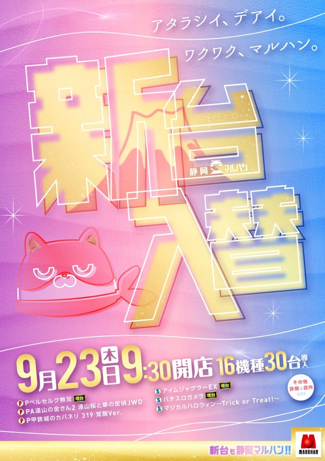 【マルハン萩原東店】明日9月9日新台入替初日9時30分開店!