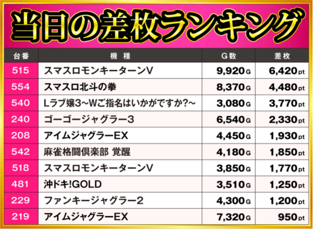 店内状況をチェックすると、人気機種を中心に多数の好調台を確認。そんな中、『スマスロモンキーターンV』が+6,420ptを記録しランキングトップに輝いた。また、ジャグラーシリーズも奮闘しており、複数の機種がランキングに名を連ねている。