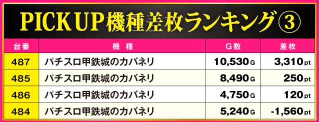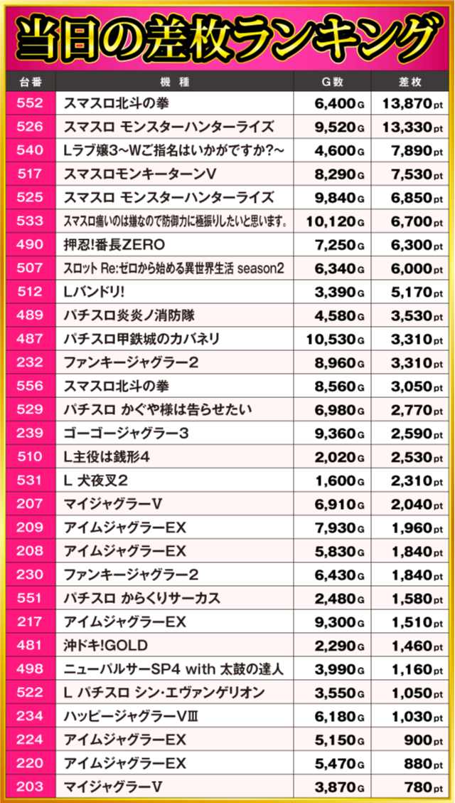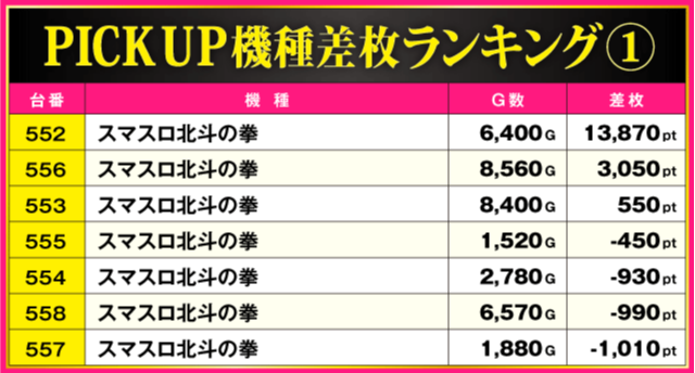 続いてPICK UP機種の状況を見てみよう。ハイスコアを記録した『スマスロ北斗の拳』と『スマスロ モンスターハンターライズ』は他の台からも好成績が発生しており、両機種合わせた全10台中5台がプラス差枚に。また、『パチスロ甲鉄城のカバネリ』も+3,310ptを筆頭に全4台中3台がプラス差枚となっている。