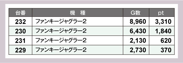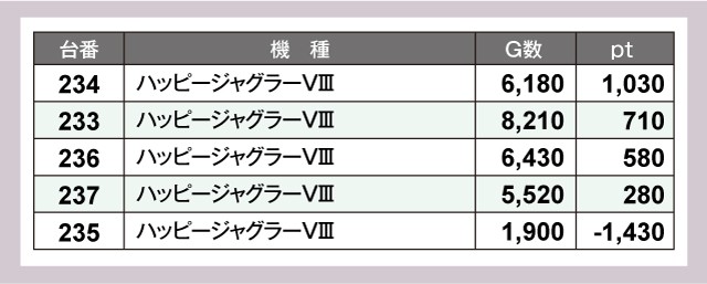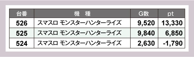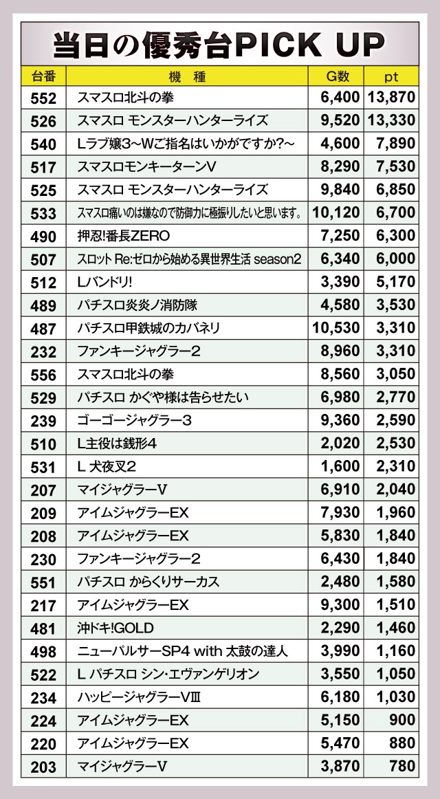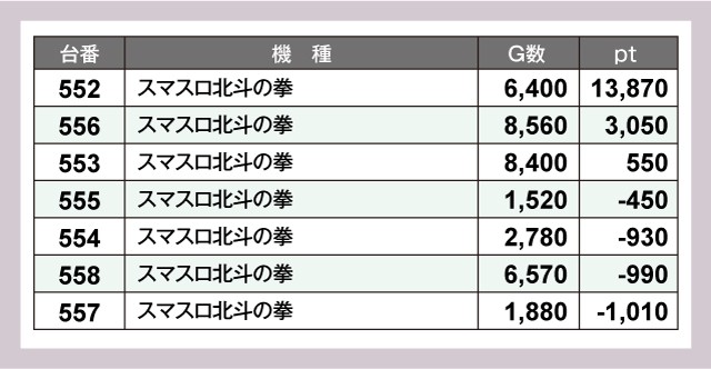 この日は552番台と526番台が1万ptオーバーを達成!なかでも『スマスロ北斗の拳』は+13,870ptと理想的な展開を迎えていた。