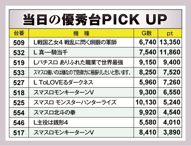 この日は509番台『L戦国乙女4 戦乱に閃く炯眼の軍師』と532番台『L 真・一騎当千』が1万ptオーバーを達成!次いで519番台『Lパチスロ ありふれた職業で世界最強』も+9,000ptオーバーと理想的な展開を迎えていた。