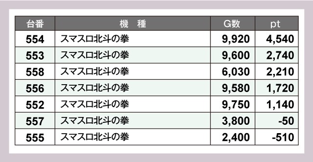 さらに『スマスロ北斗の拳』は7台中5台がプラスと盛況。プラスとなった5台すべてが4桁ptを獲得していた。