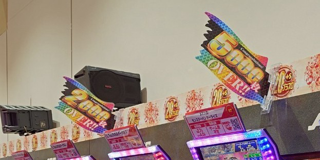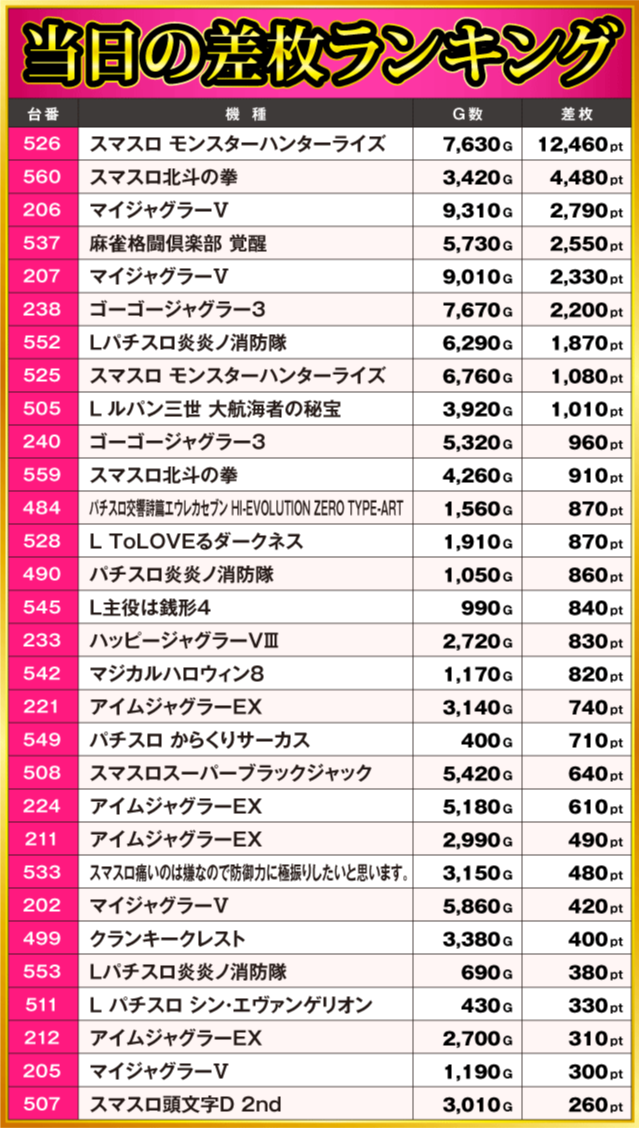 早速、店内状況をチェックすると、人気のスマスロを中心にハイスコアが続出。そんな中、『スマスロ モンスターハンターライズ』が万枚超の+12,460ptを叩き出し堂々のランキングトップに輝いた。また、Aタイプながらジャグラーシリーズも奮闘しており、複数の台が上位にランクインしている。