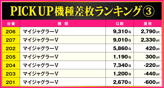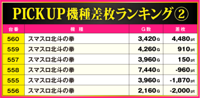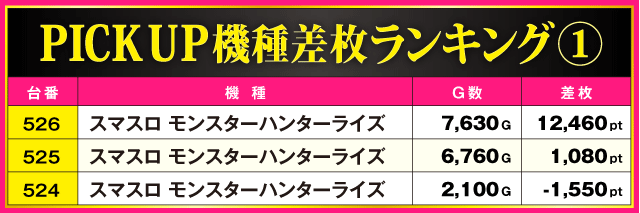 今回のPICK UP機種は、ランキングを制した『スマスロ モンスターハンターライズ』をはじめ『スマスロ北斗の拳』と『マイジャグラーⅤ』の3機種。それぞれの機種で好調台が多数確認されており、3機種トータルの全16台中9台がプラス差枚となる盛況ぶりを見せていた。