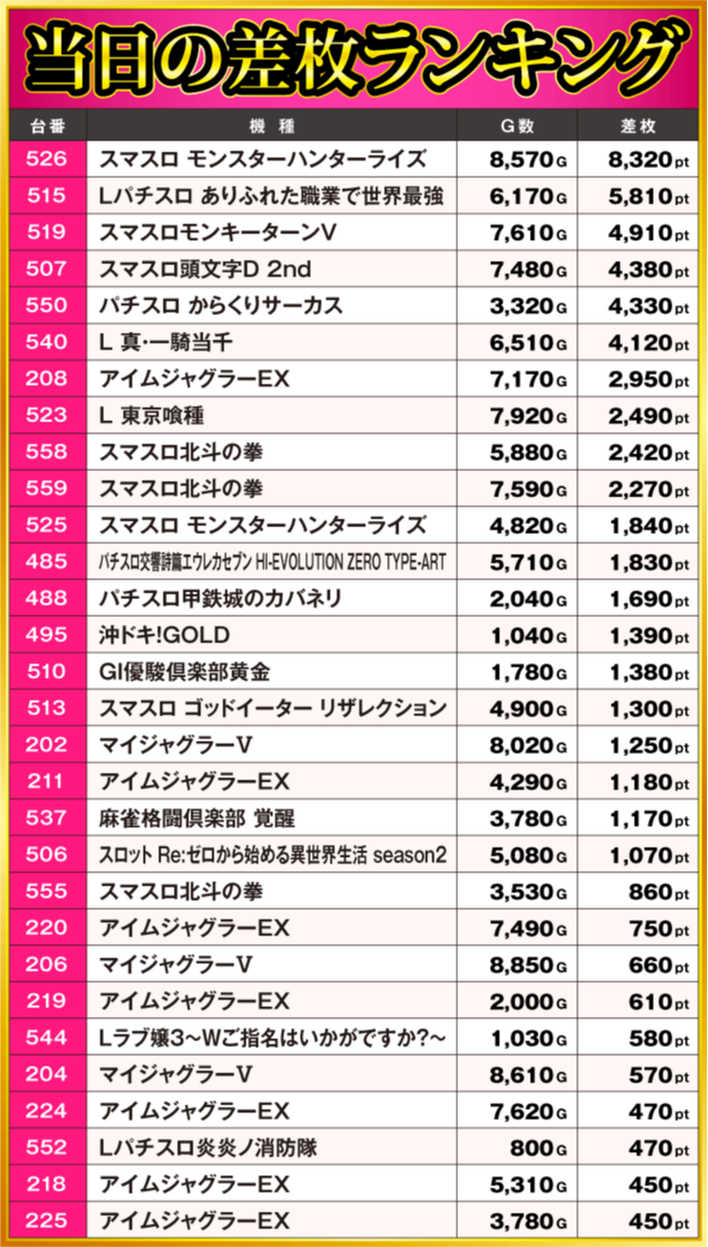 早速、店内状況をチェックすると、人気機種を中心にハイスコアが続出。そんな中、『スマスロ モンスターハンターライズ』が+8,320ptを叩き出しランキングトップに。また、ジャグラーシリーズも大奮闘しており『アイムジャグラーEX』と『マイジャグラーⅤ』から多数の好成績が発生している。