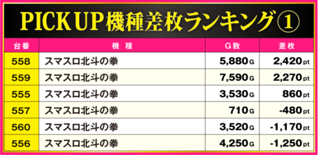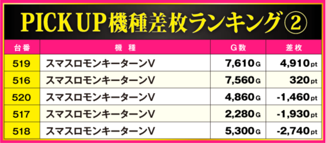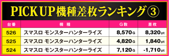 今回のPICK UP機種は、ランキングを制した『スマスロ モンスターハンターライズ』をはじめ『スマスロ北斗の拳』と『スマスロモンキーターンV』の3機種。それぞれの機種で好調台が多数確認されており、3機種トータルの全14台のうち半数の台がプラス差枚となる盛況ぶりを見せていた。
