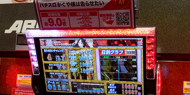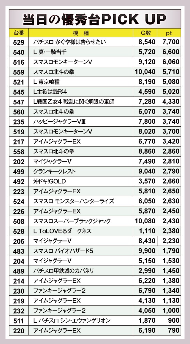 この日は『パチスロ かぐや様は告らせたい』529番台が+7,000ptオーバーを達成!さらに『L 真・一騎当千』540番台や『スマスロモンキーターンV』516番台も+6,000ptオーバーと圧巻のパフォーマンスを披露している。