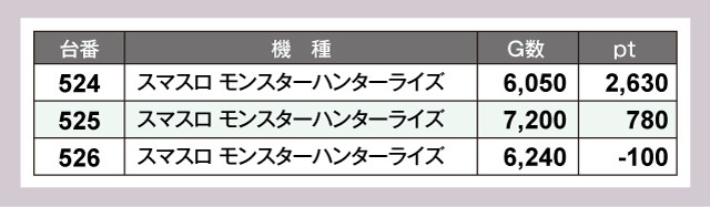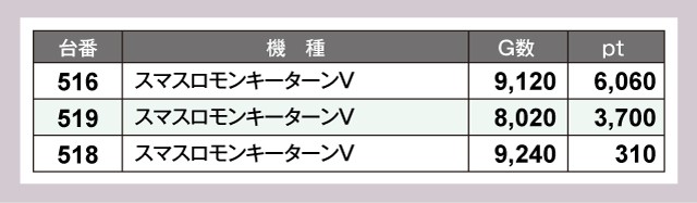 『スマスロモンキーターンV』では3台がプラス差枚で終了。516番台は+6,060ptと見事な活躍を見せている。