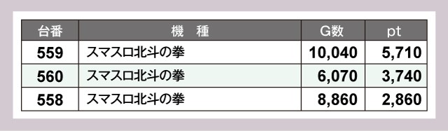『スマスロ北斗の拳』も絶好調。こちらも3台がプラスで、全て4桁ptオーバーと優秀な結果だった。