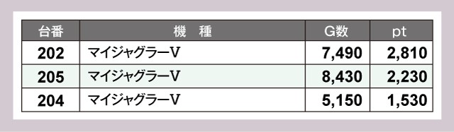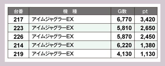 さらにAタイプの『マイジャグラーⅤ』や『アイムジャグラーEX』も盛況で、なかには+3,000pt超の好調台も確認できた。