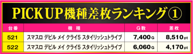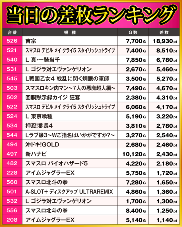 当日の差枚ランキング