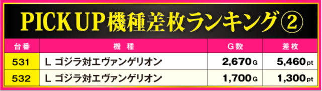 続いてPICK UP機種の状況を見ていこう。『スマスロ デビル メイ クライ5 スタイリッシュトライブ』は+8,000pt超以外に+4,170pt、『L ゴジラ対エヴァンゲリオン』からは+5,460ptが発生。また、『スマスロ北斗の拳』は半数の台がプラス差枚となる見事な結果を残している。