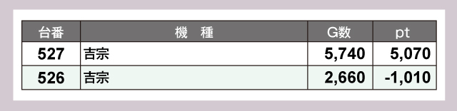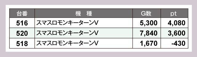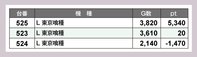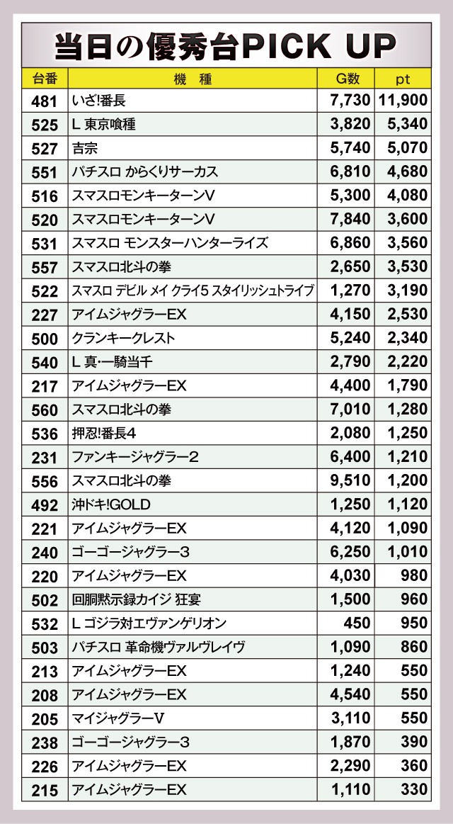 もっとも躍動したのは『いざ!番長』。481番台が+11,900ptと、誰もがうらやむ結果を残していた。次いで『L 東京喰種』525番台の+5,340pt、『吉宗』527番台の+5,070ptが並ぶ。以下にも『パチスロ からくりサーカス』551番台の+4,680pt、『スマスロモンキーターンV』516番台の+4,080pt、520番台の+3,600ptなど、見応えのあるデータが集まっていた。