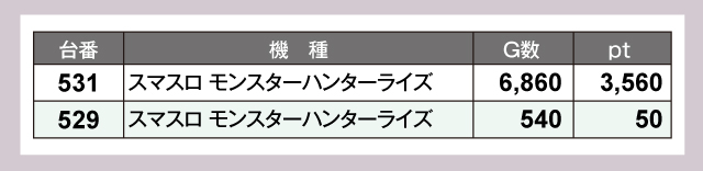 『スマスロ モンスターハンターライズ』の命運を分けたのもG数。しっかり回しきった531番台が大幅プラスを叩きだしている。