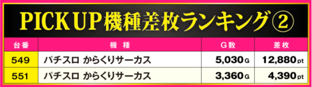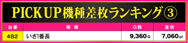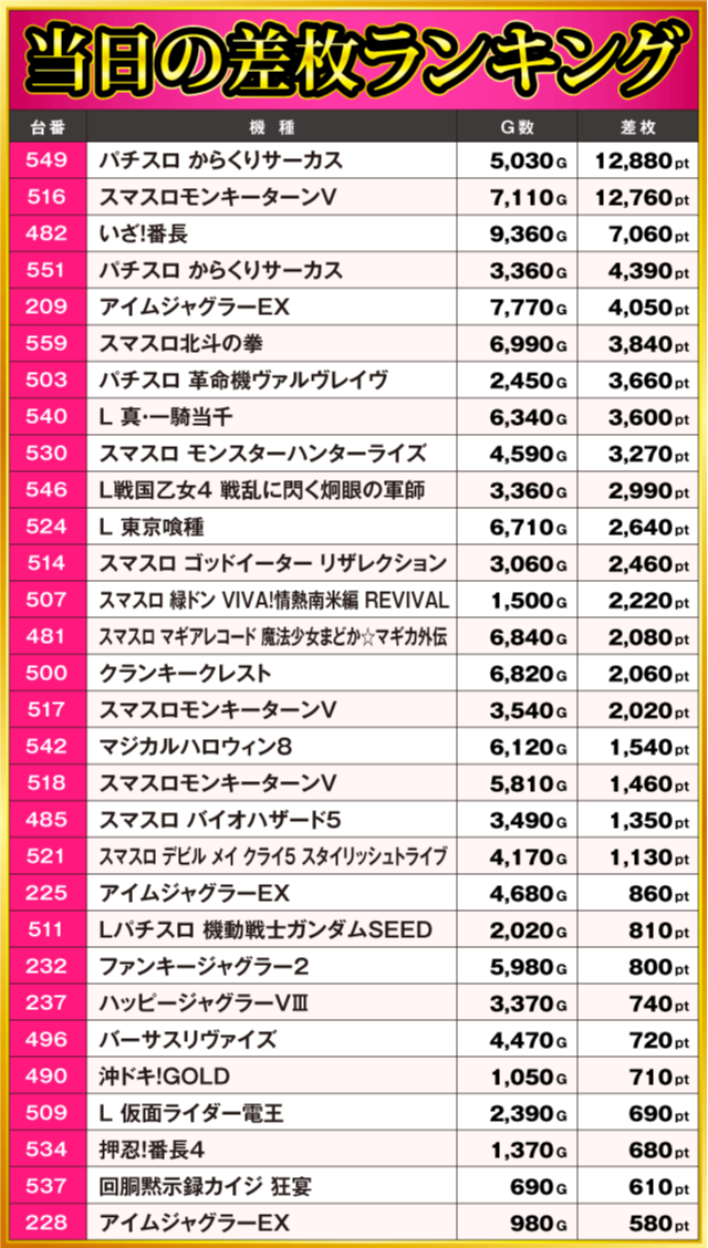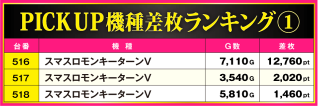今回のPICK UP機種は差枚上位にランクインした3機種。ハイスコアが飛び出しただけでなく、3機種トータルの全9台中6台がプラス差枚で実戦を終える見事な結果を残しているだけに、ファンにとって充実の一日となったのは間違いないだろう。