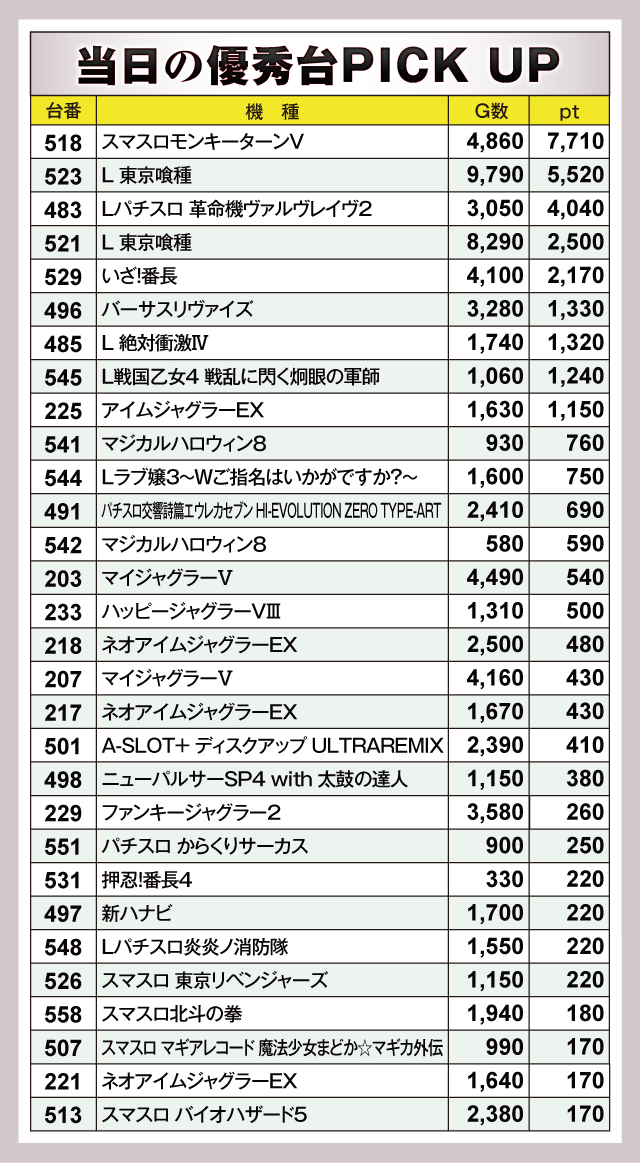 『スマスロモンキーターンV』518番台が+7,710ptと、ひときわ輝く成績をおさめている。そして『L 東京喰種』523番台が+5,520pt、『Lパチスロ 革命機ヴァルヴレイヴ2』483番台が+4,040ptでつづく。以下にも『L 東京喰種』521番台の+2,500pt、『いざ!番長』529番台の+2,170ptなど、プレイヤー大満足の結果がならんでいた。