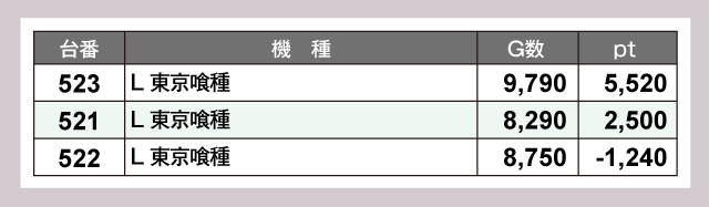 人気の『L 東京喰種』は全台が高稼働。3台中2台がプラスptで、実力もしっかりと示していた。