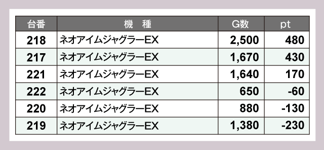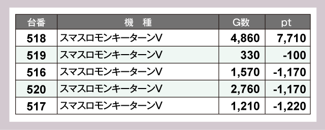 『ネオアイムジャグラーEX』は3台がプラスだったが少し低調か。『スマスロモンキーターンV』は1台のみがプラスだが、その518番台が大きな成果をあげている。
