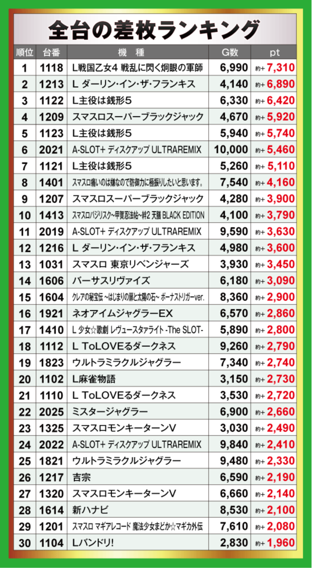 また、その他の機種では『L ダーリン・イン・ザ・フランキス』が+6,000pt超、『スマスロスーパーブラックジャック』と『A-SLOT+ ディスクアップ ULTRAREMIX』が+5,000pt超を記録。機種の新旧を問わず、広範囲に渡ってチャンスが潜んでいたのは間違いないだろう。
