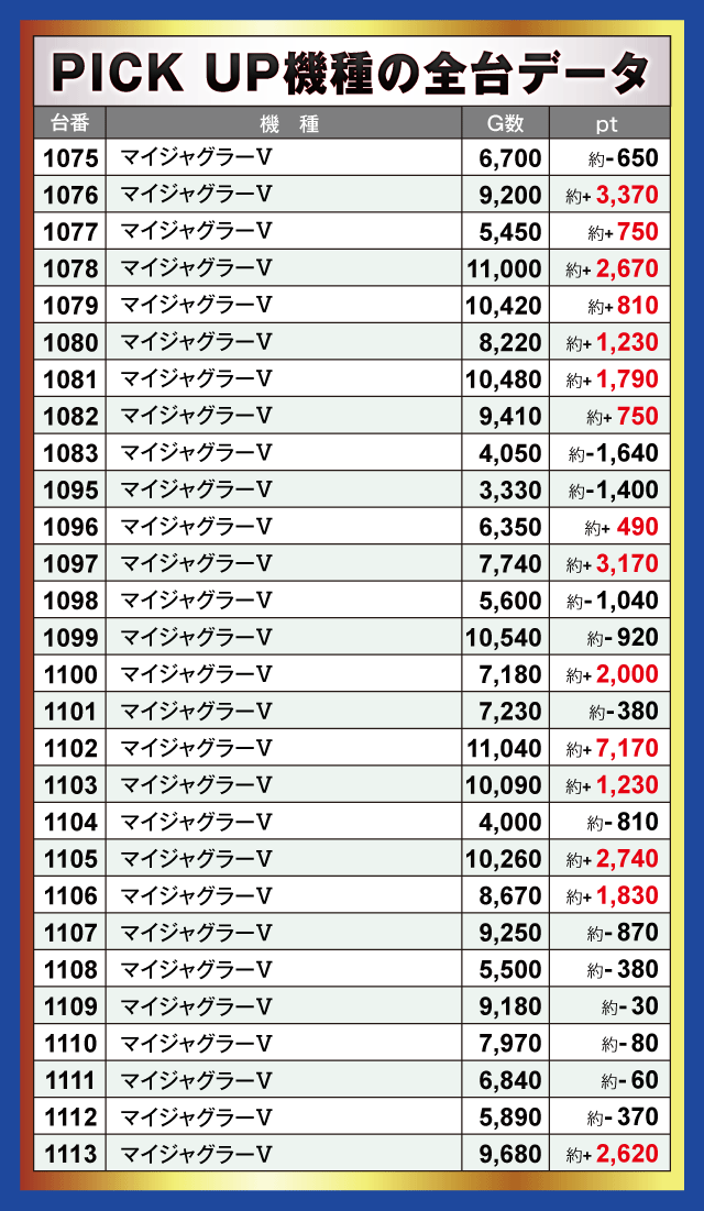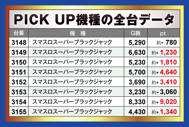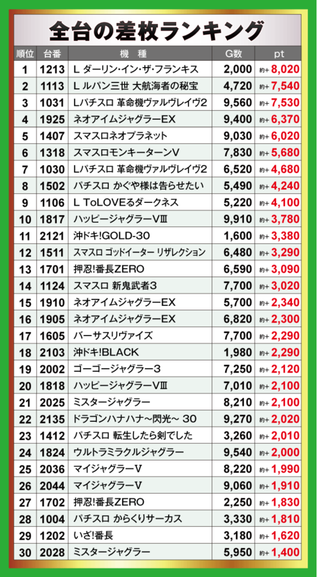 また、その他にもAタイプの『ネオアイムジャグラーEX』と導入直後の新台『スマスロネオプラネット』が+6,000pt超、未だ根強い人気を誇る『スマスロモンキーターンV』が+5,000pt超を記録。機種のタイプや新旧を問わず広範囲に渡ってチャンスが潜んでいたのは間違いないだろう。