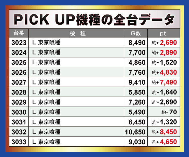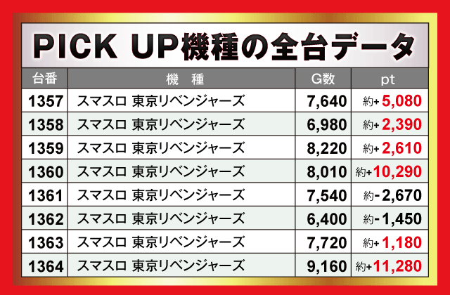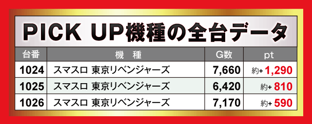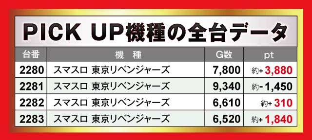 今回の全店共通PICK UP機種は前回と同じく『スマスロ 東京リベンジャーズ』。全店舗の総台数24台のうち半数以上の17台がプラス差枚に。しかも、平均差枚は+2,000pt超を記録しており、各店舗のシマは終日ファンの笑顔と活気満ち溢れていた。